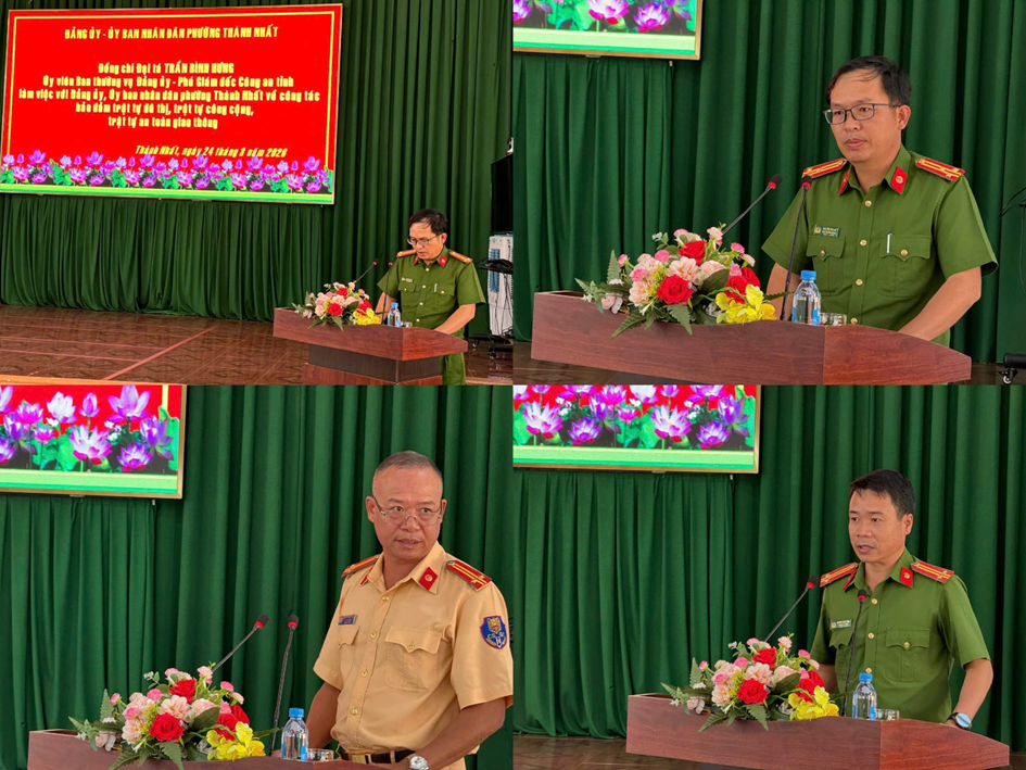 Tại buổi làm việc, lãnh đạo Công an phường Thành Nhất đã báo cáo tình hình, kết quả thực hiện công tác bảo đảm TTĐT, TTCC, TTATGT trong thời gian qua. Theo đó, lực lượng Công an phường đã chủ động tham mưu lãnh đạo Công an tỉnh, cấp uỷ, chính quyền địa phương triển khai nhiều biện pháp nhằm lập lại trật tự đô thị, trật tự công cộng; tổ chức trên 120 lượt tuần tra, kiểm soát, qua đó phát hiện, xử lý hơn 150 trường hợp vi phạm về lấn chiếm lòng, lề đường, vỉa hè để kinh doanh buôn bán trái phép; nhắc nhở, cam kết đối với gần 300 hộ dân, cơ sở kinh doanh chấp hành quy định về TTĐT, TTCC.