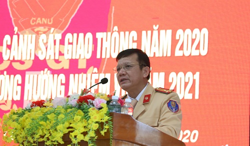 Đ/c Thượng tá Vũ Tiến Thăng - Trưởng phòng CSGT Công an tỉnh phát biểu tại Hội nghị Tổng kết công tác năm của lực lượng Cảnh sát giao thông