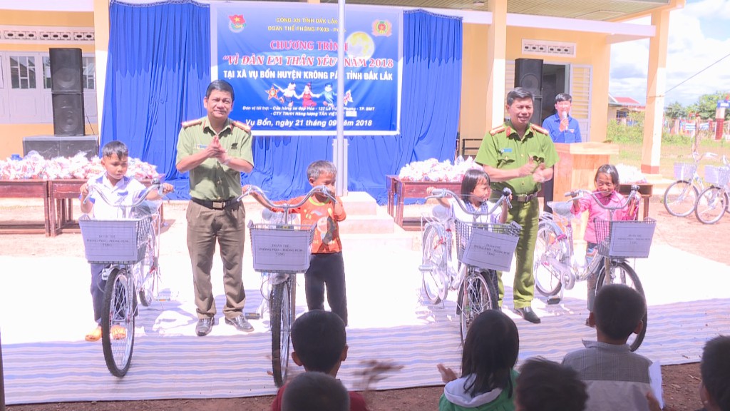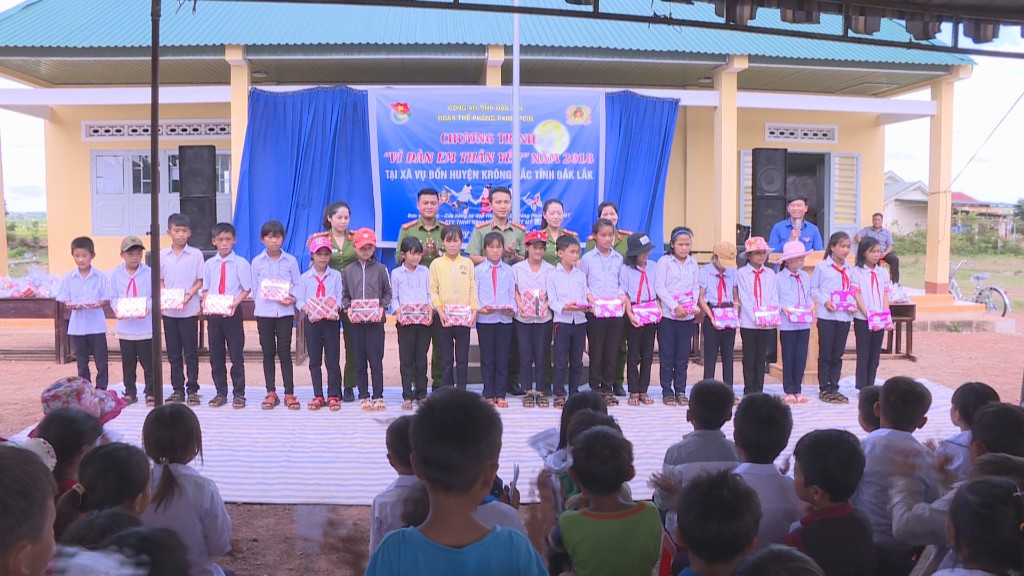 Các phòng nghiệp vụ của Công an tỉnh Đắk Lắk cùng Cty TNHH năng lượng Tân Việt Mỹ vừa phối hợp tổ chức tết trung thu cho điểm trường tiểu học Hoàng Diệu ở thôn 12, xã Vụ Bổn, huyện Krông Pắk.