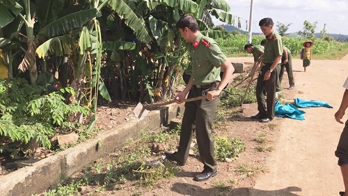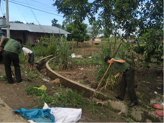 Cán bộ, chiến sĩ tham gia nạo vét cống rãnh và dọn vệ sinh dọc tuyến đường vào buôn