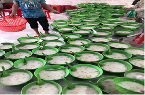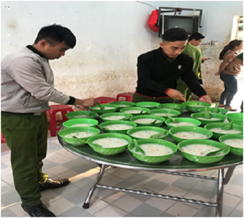 Cán bộ, chiến sĩ chia các suất cháo gửi đến các bệnh nhân tại Trung tâm chăm sóc và phục hồi chức năng