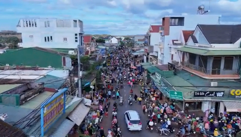 Khu vực chợ Ea Wy dịp Tết năm 2025 còn diễn ra tình trạng buôn bán lấn chiếm, phương tiện và người dân tập trung đông, gây ùn tắc giao thông.