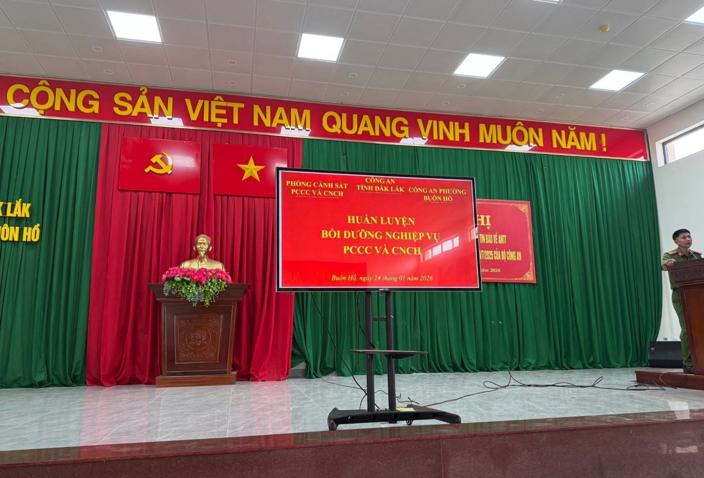 Để bảo đảm an toàn phòng cháy, chữa cháy trên địa bàn phường Buôn Hồ đặc biệt trong dịp Tết Nguyên đán Bính Ngọ năm 2026. Ngày 24/01/2026, Công an phường Buôn Hồ phối hợp Đội chữa cháy và cứu nạn, cứu hộ khu vực 2 – Phòng Cảnh sát phòng cháy, chữa cháy và cứu nạn, cứu hộ (PCCC và CNCH) Công an tỉnh Đắk Lắk tổ chức lớp huấn luyện nghiệp vụ PCCC và CNCH.