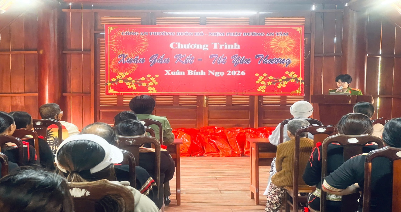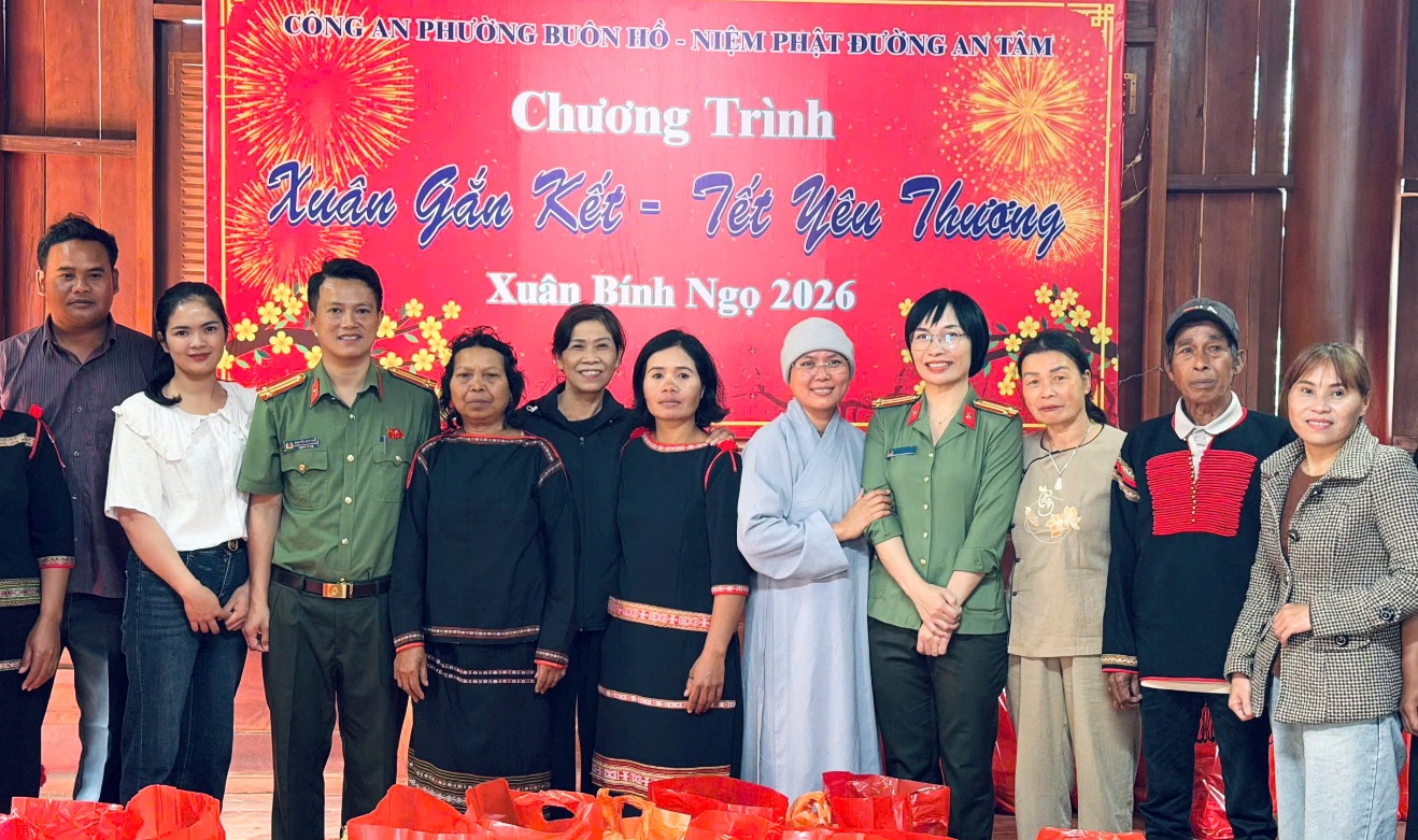 Trong 02 ngày 04/02/2026 và 10/02/2026, thực hiện Kế hoạch Chương trình “Xuân gắn kết, tết yêu thương”, nhằm phát huy truyền thống “Uống nước nhớ nguồn”, Công an phường Buôn Hồ phối hợp cùng Niệm Phật đường An Tâm tổ chức trao tặng 104 phần quà Tết cho Nhân dân có hoàn cảnh khó khăn, gia đình chính sách trên địa bàn phường Buôn Hồ với tổng giá trị 42 triệu đồng.