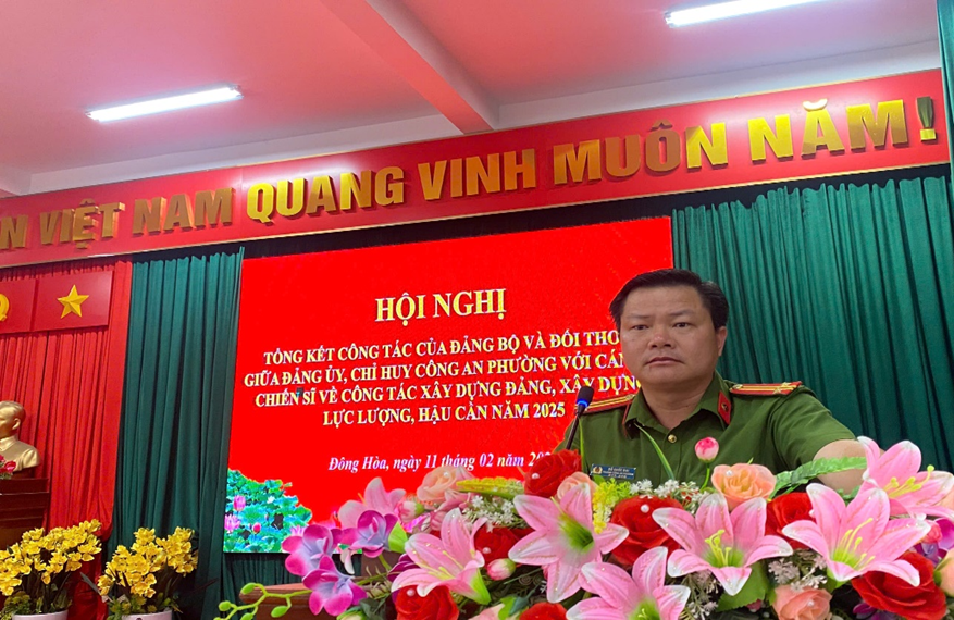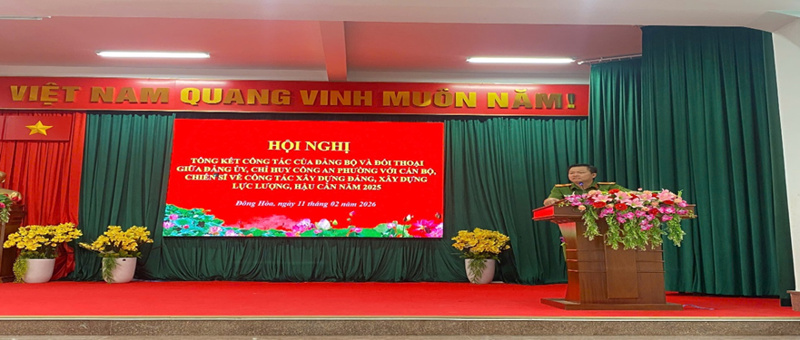 Chiều ngày 11/02/2026, Công an phường Đông Hoà tổ chức Hội nghị tổng kết công tác Đảng bộ năm 2025 và Hội nghị đối thoại giữa Đảng uỷ, Chỉ huy Công an phường với cán bộ, chiến sĩ về công tác xây dựng Đảng, xây dựng lực lượng và công tác hậu cần.