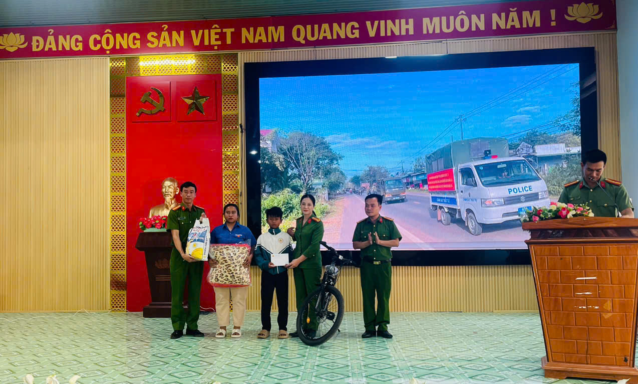 Trao quà tặng là 01 chiếc xe đạp trị giá 2,2 triệu đồng cho “Con nuôi Công an xã” và hỗ trợ gạo, chăn cùng đồ sinh hoạt hàng ngày cho gia đình con nuôi