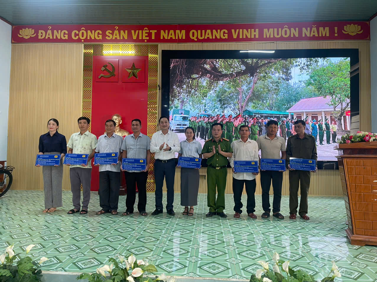 Trao các bảng hiệu đường dây nóng nhằm tạo điều kiện cho Nhân dân phản ánh những yêu cầu cần thiết trong công tác đảm bảo ANTT tại cơ sở