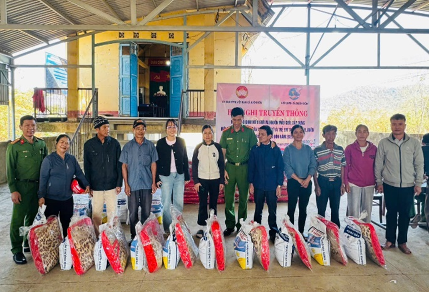Cán bộ Công an xã Buôn Đôn cùng cán bộ thôn, buôn và người có uy tín thăm hỏi, động viên và hỗ trợ cho những hộ gia đình có hoàn cảnh khó khăn.