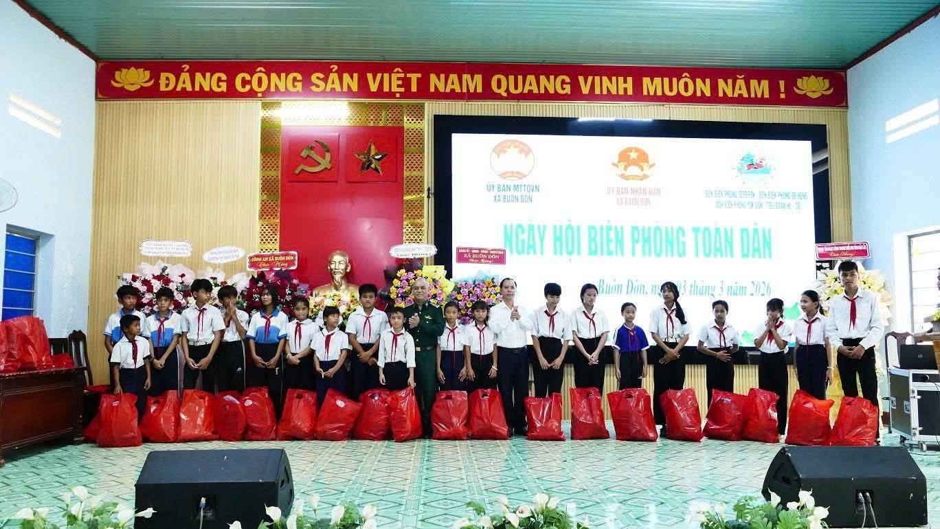 Phối hợp với cấp uỷ, chính quyền địa phương và lực lượng Biên phòng tặng quà cho các em học sinh người dân tộc thiểu số có thành tích cao trong học tập.