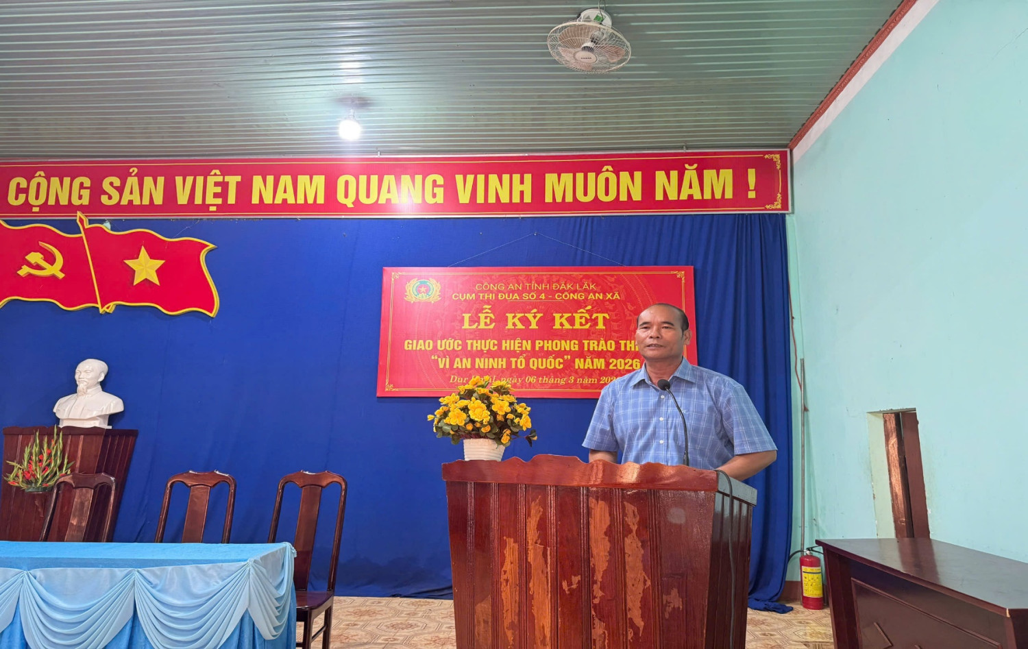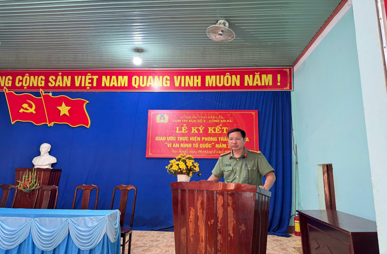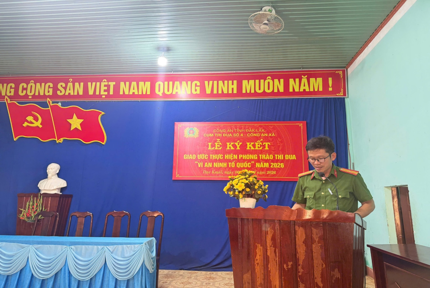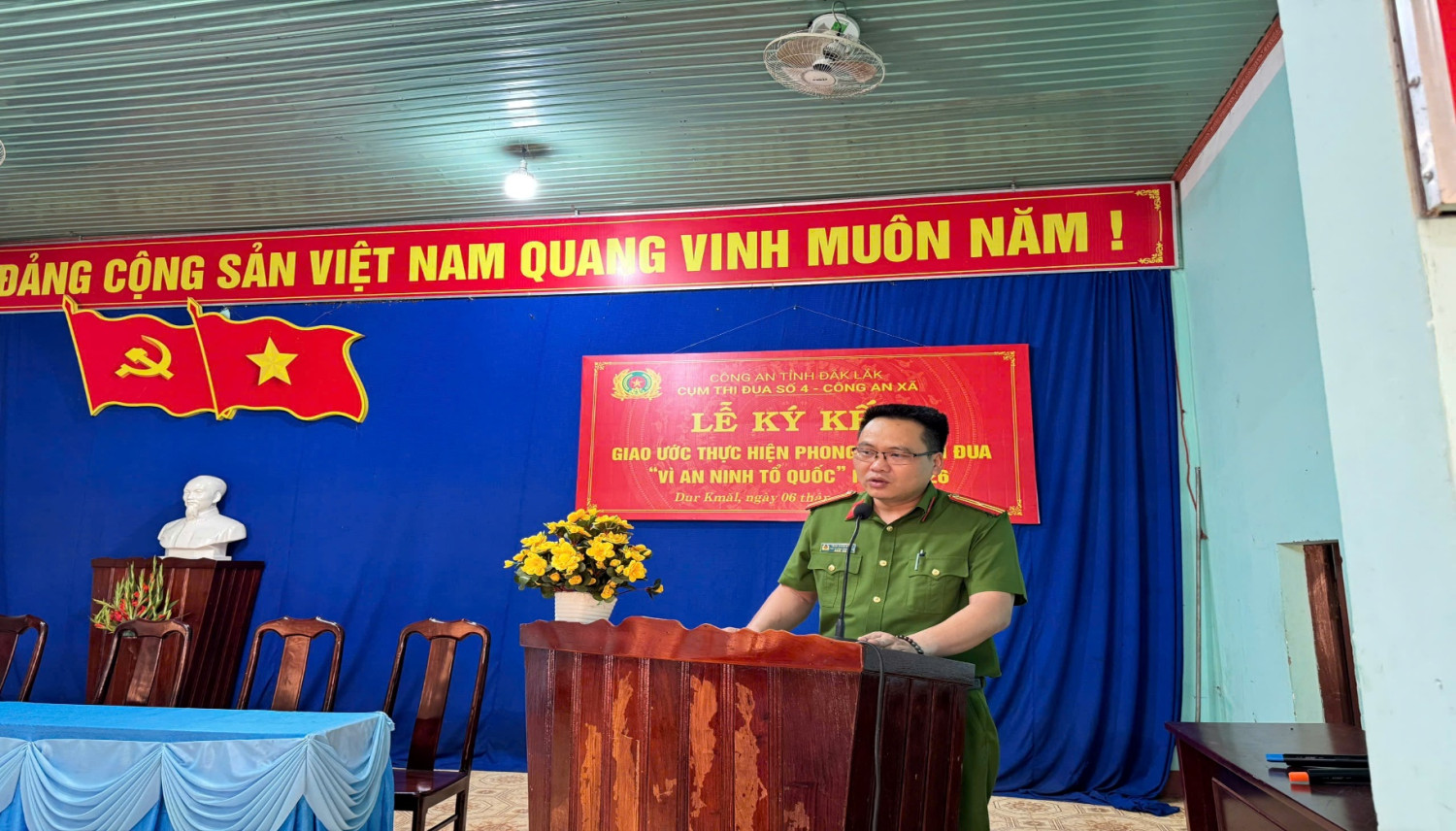 Được sự đồng ý của Lãnh đạo Công an tỉnh; thực hiện quy chế làm việc của Cụm thi đua, chiều ngày 06 tháng 3 năm 2026, tại Trụ sở Công an xã Dur Kmăl, đơn vị Cụm trưởng Cụm thi đua số 4 – Công an xã đã tổ chức thành công Lễ ký kết Giao ước thi đua thực hiện phong trào “Vì an ninh Tổ quốc” năm 2026.