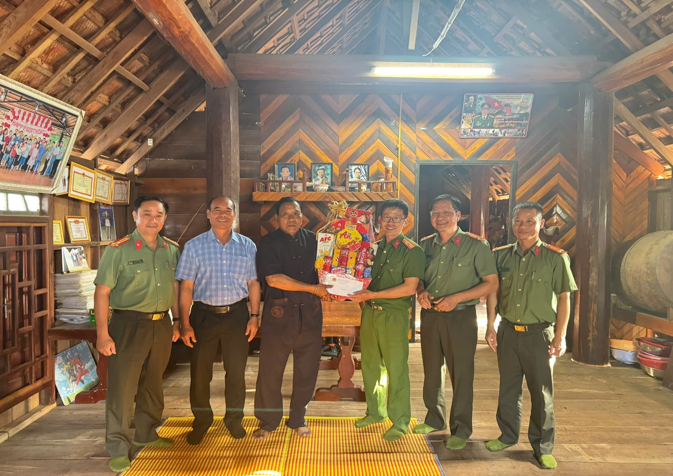 (Đại diện lãnh đạo các đơn vị, Công an các xã trong Cụm thi đua thăm, chúc sức khỏe người có uy tín trong vùng đồng bào DTTS)