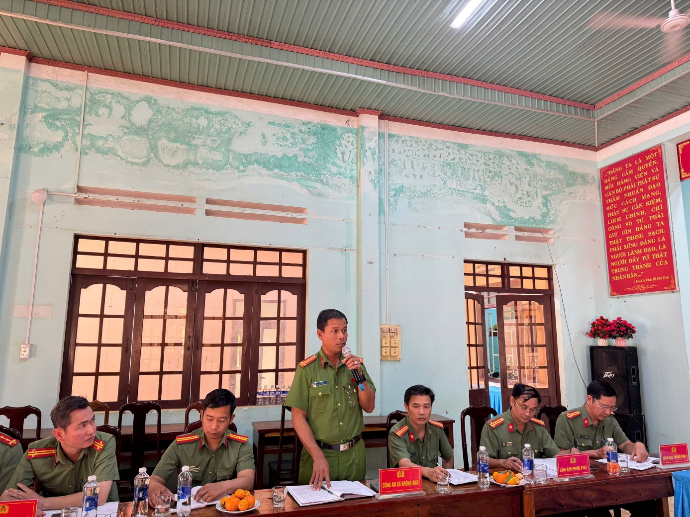 (Đồng chí Thiếu tá Nguyễn Anh Tuân – Trưởng Công an xã Dur Kmăl, Cụm trưởng Cụm thi đua phát biểu tại Hội nghị)