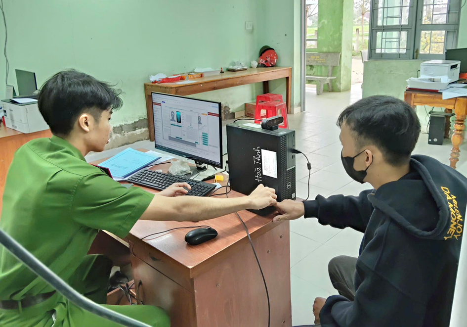 Cán bộ Công an xã tận tình hướng dẫn người dân thu nhận vân tay, kiểm tra thông tin để bảo đảm chính xác, đầy đủ khi làm định danh điện tử mức độ 2