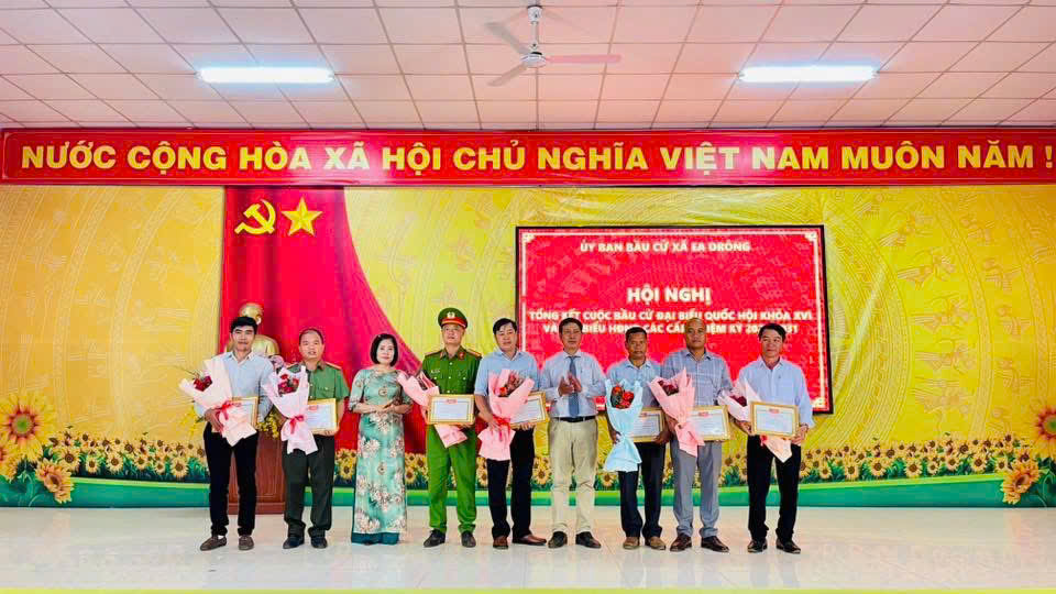 Ghi nhận những kết quả đạt được, tại Hội nghị tổng kết cuộc bầu cử đại biểu Quốc hội và đại biểu Hội đồng nhân dân các cấp nhiệm kỳ 2026 - 2031 do UBND xã Ea Drông tổ chức ngày 20/3/2026, Công an xã Ea Drông vinh dự được Chủ tịch UBND xã tặng Giấy khen cho 01 tập thể và 10 cá nhân CBCS, 04 cá nhân lực lượng tham gia bảo vệ ANTT cơ sở. Đây là sự ghi nhận xứng đáng đối với những nỗ lực, đóng góp tích cực của lực lượng Công an xã trong công tác bảo đảm an ninh, trật tự, góp phần quan trọng vào thành công chung của cuộc bầu cử trên địa bàn xã.