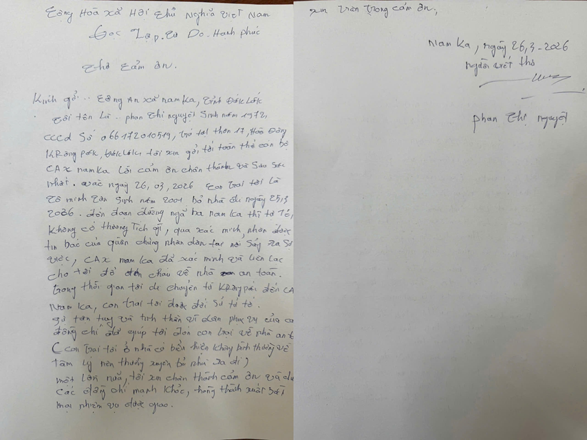 Nội dung thư bày tỏ sự trân trọng, cảm kích trước tinh thần trách nhiệm, sự tận tụy trong công tác của lực lượng Công an xã Nam Ka khi đã kịp thời tiếp nhận, xác minh và hỗ trợ để gia đình đón cháu Tô Minh Tân về nhà an toàn.