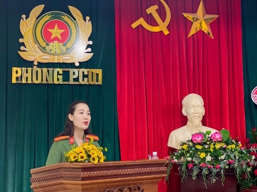 Đồng chí Thiếu tá Phan Lệ Quyên – Phó Chủ tịch Hội phụ nữ Công an tỉnh phát biểu tại Đại hội