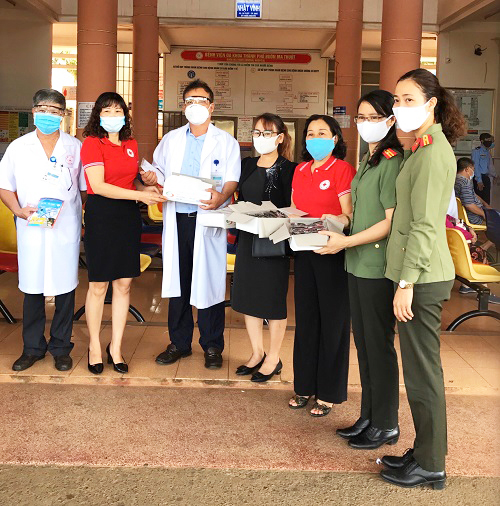 Hội phụ nữ Công an tỉnh phối hợp với các mạnh thường quân tặng khẩu trang, kính bảo hộ cho đội ngũ các y, bác sĩ tại Bệnh viện TP.BMT (ngày 28/3/2020)