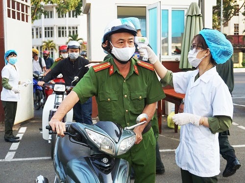 Đo thân nhiệt cho cán bộ, chiến sĩ làm việc tại trụ sở Công an tỉnh