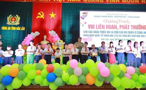 Bên cạnh đó, ngày 31/5/2022, Công an tỉnh đã tổ chức các hoạt động vui chơi, liên hoan, sinh hoạt văn nghệ và tặng quà khen thưởng cho các em thiếu nhi, học sinh là con em đồng bào Buôn Tu, xã Ea Tul, huyện Cư M’gar - buôn kết nghĩa với Công an tỉnh nhân Ngày Quốc tế thiếu nhi và tổng kết năm học vừa qua nhằm động viên, khuyến khích các cháu tiếp tục rèn luyện, phấn đấu đạt được nhiều thành tích cao trong học tập.