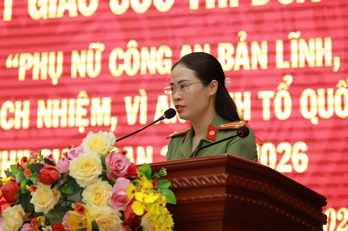 Đ/c Thượng tá Nguyễn Thị Quế - Phó Chủ tịch Hội phụ nữ Bộ Công an phát biểu tại Hội nghị