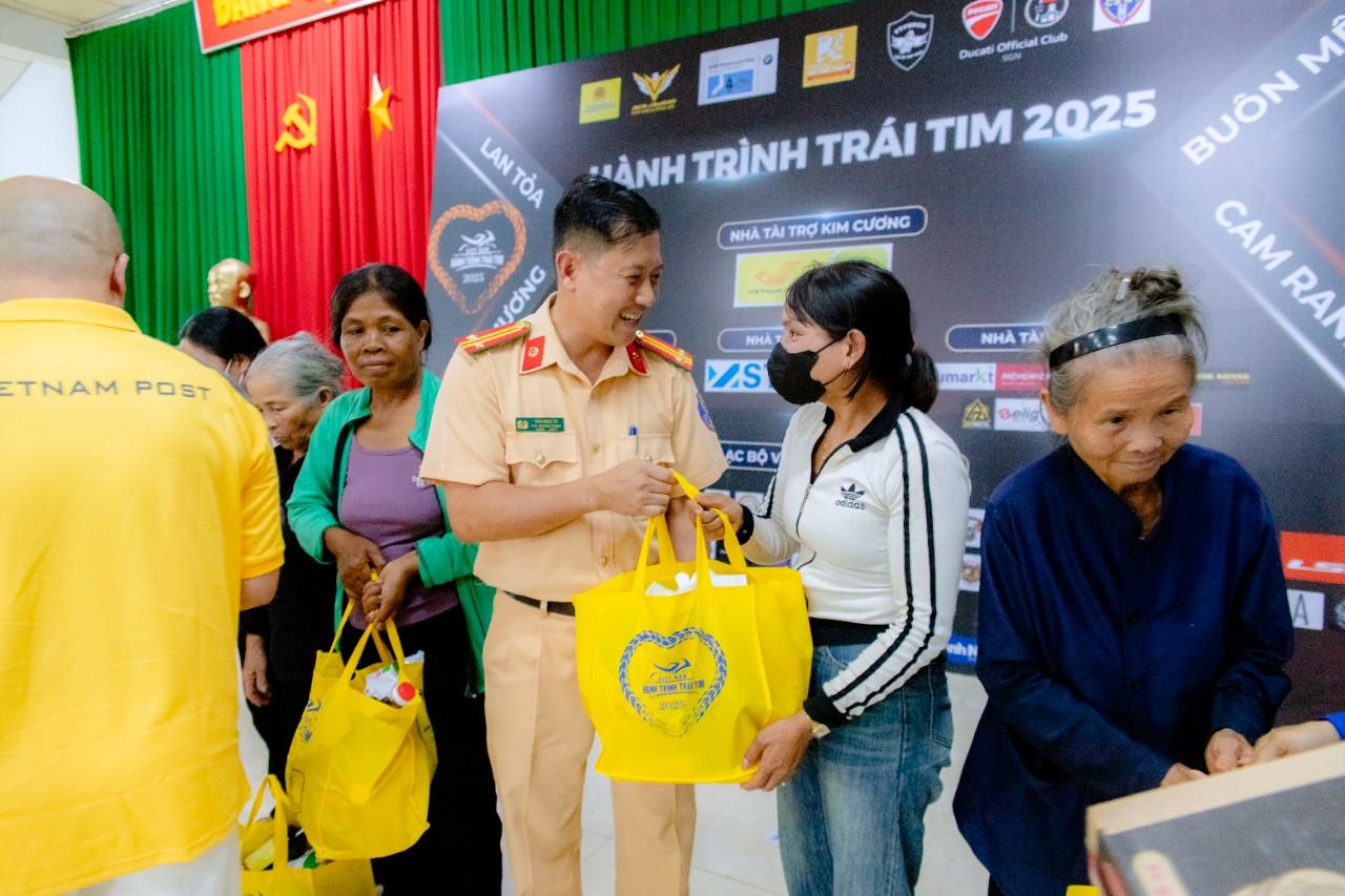 Chương trình “Hành trình trái tim năm 2025” diễn ra trong bầu không khí ấm cúng, sẻ chia tại hội trường Ủy ban nhân dân xã Ea Ktur, huyện Cư Kuin. Tại Chương trình, 500 phần quà thiết thực (mỗi phần quà trị giá 600 ngàn đồng, tương đương tổng kinh phí hỗ trợ là 300 triệu đồng), có ý nghĩa đã được gửi đến các hộ gia đình có hoàn cảnh khó khăn trên địa bàn xã. Bên cạnh đó, cán bộ chiến sỹ phòng Cảnh sát giao thông còn tiến hành lồng ghép tuyên truyền, phổ biến các quy định của pháp luật về trật tự, an toàn giao thông đường bộ đến người dân.
