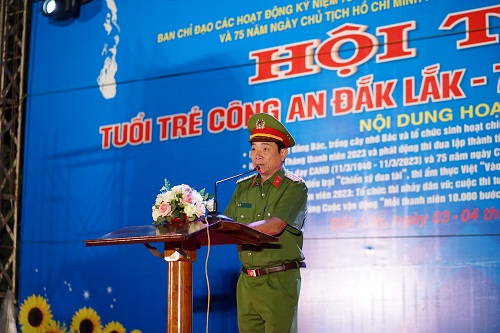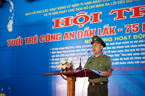 Phát biểu tại Lễ khai mạc Hội trại, đồng chí Đại tá Nguyễn Văn Hội - Ủy viên BTV, Phó Giám đốc Công an tỉnh đã biểu dương, khen ngợi Đoàn Thanh niên Công an tỉnh đã chủ động, sáng tạo tham mưu cho Đảng ủy, lãnh đạo Công an tỉnh tổ chức nhiều hoạt động trong thời gian qua, trong đó có Hội trại “Tuổi trẻ Công an Đắk Lắk – 75 năm khắc ghi lời Bác”. Đồng thời khẳng định, Hội trại là một hoạt động trong chuỗi sự kiện kỷ niệm 75 năm Ngày Chủ tịch Hồ Chí Minh nêu Sáu điều dạy CAND và ra lời kêu gọi thi đua ái quốc, là dịp sinh hoạt chính trị quan trọng để cán bộ, chiến sỹ, đoàn viên, thanh niên Công an thấm nhuần sâu sắc hơn Sáu điều Bác Hồ dạy và cũng là dịp để giao lưu giữa cán bộ, chiến sỹ giữa các đơn vị trong toàn Công an tỉnh.