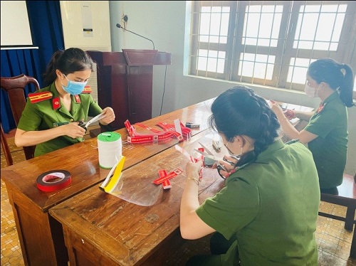 Hội phụ nữ Công an thị xã Buôn Hồ làm mũ chống giọt bắn gửi tặng lực lượng làm nhiệm vụ các chốt phòng, chống dịch bệnh Covid -19