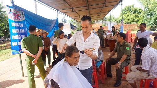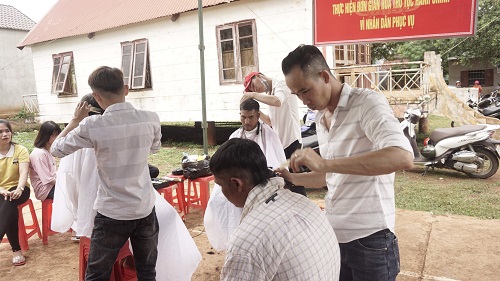 Cắt tóc miễn phí cho các cụ già và thanh thiếu niên trong buôn làng vùng sâu