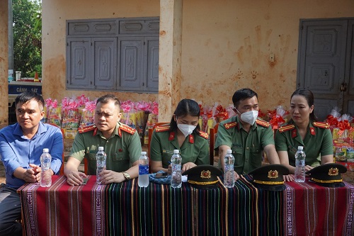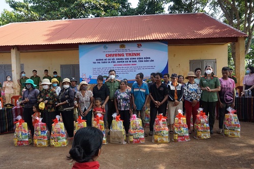 Đại diện Thường trực Đoàn Thanh niên – Hội phụ nữ Công an tỉnh trao tặng các suất quà cho các hộ gia đình chính sách, có hoàn cảnh khó khăn trên địa bàn thị trấn Ea Pốk