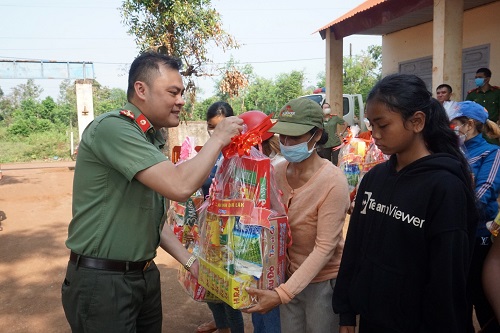 Đại diện lãnh đạo Phòng công tác Đảng và công tác chính trị và lãnh đạo Công an huyện Cư M’gar trao tặng các suất quà cho các hộ gia đình chính sách, có hoàn cảnh khó khăn trên địa bàn thị trấn Ea Pốk