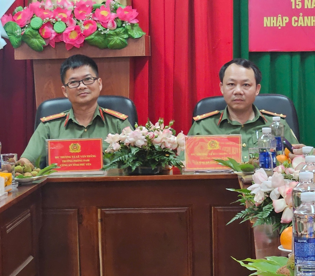 Đồng chí Thượng tá Lê Văn Thắng – Trưởng Phòng Quản lý xuất nhập cảnh, Công an tỉnh Phú Yên trao đổi những kinh nghiệm hay trong công tác quản lý xuất nhập cảnh