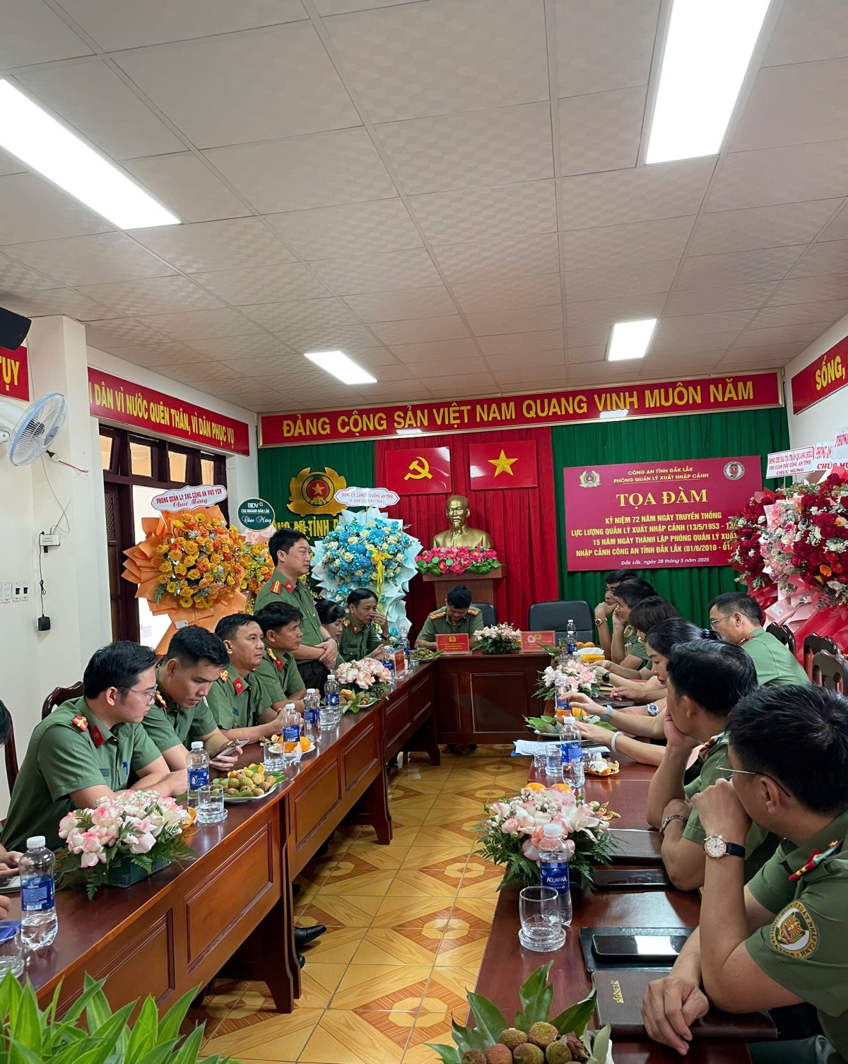 Trong không khí trang trọng của buổi Toạ đàm, đơn vị rất vinh dự được đón tiếp đoàn công tác Phòng Quản lý xuất nhập cảnh Công an tỉnh Phú Yên do đồng chí Thượng tá Lê Văn Thắng - Trưởng phòng làm Trưởng đoàn. Tiếp đón và làm việc với đoàn có đồng chí Thượng tá Bùi Trọng Tuấn - Trưởng phòng Quản lý xuất nhập cảnh Công an tỉnh Đắk Lắk và các đồng chí lãnh đạo, chỉ huy cùng toàn thể cán bộ chiến sĩ đơn vị.