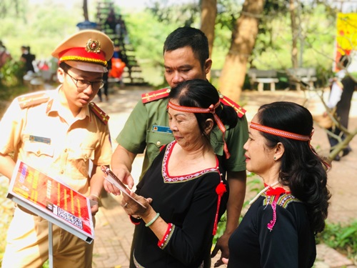 Các đoàn viên thanh niên Công an huyện Buôn Đôn hướng dẫn người dân cách truy cập để khai thác, sử dụng bản đồ số du lịch