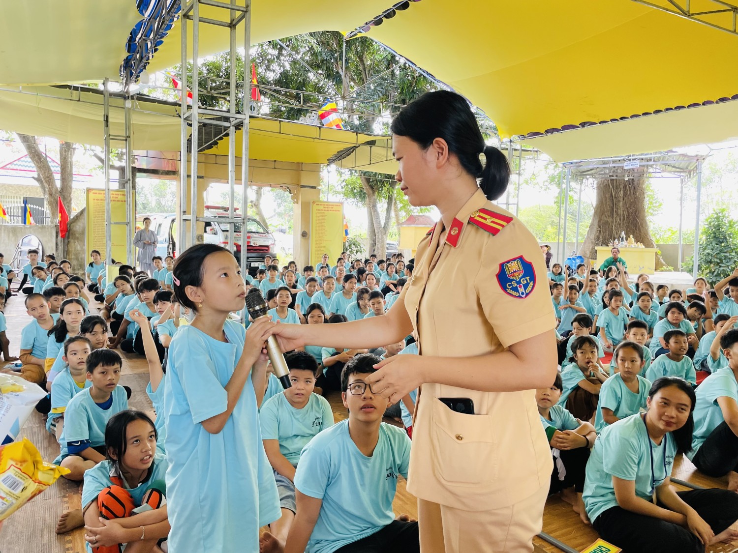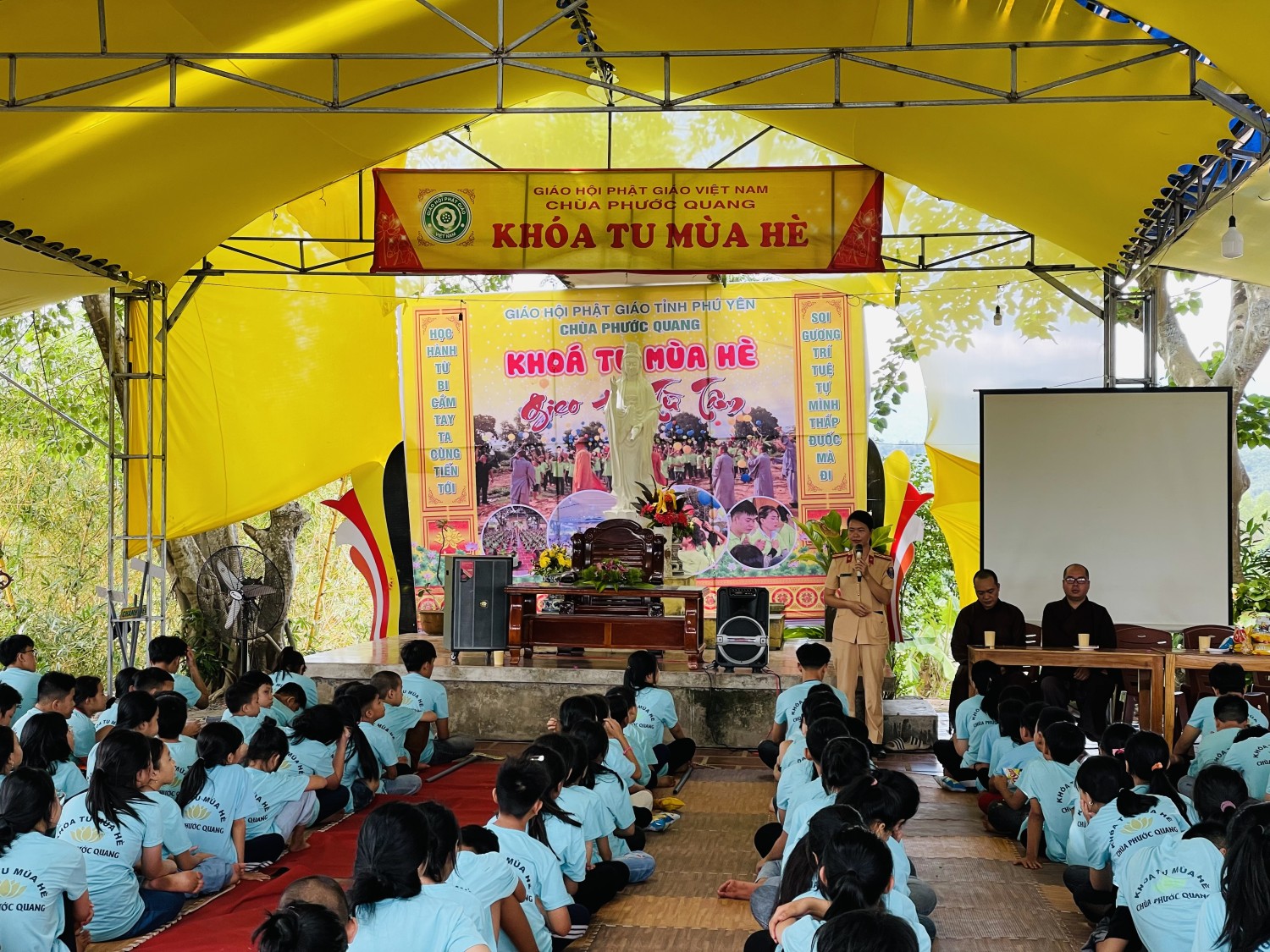 Thực hiện kế hoạch phối hợp giữa Phòng Cảnh sát giao thông, Công an tỉnh và Ban trị sự GHPG Việt Nam tỉnh Phú Yên về tăng cường tuyên truyền pháp luật về ATGT, sáng ngày 16/6, Phòng CSGT đã tổ chức tuyên truyền pháp luật về ATGT cho 380 Phật tử, là các em học sinh từ cấp tiểu học đến trung học phổ thông trên địa bàn tỉnh Phú Yên, tham gia khóa tu mùa hè năm 2023 tại chùa Phước Quang, huyện Sông Hinh