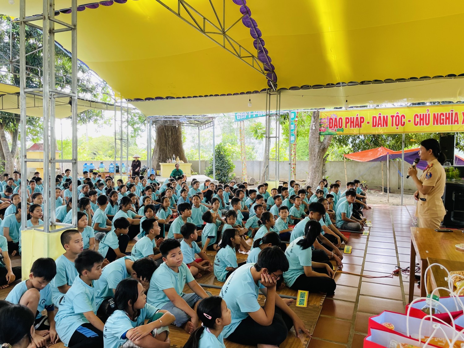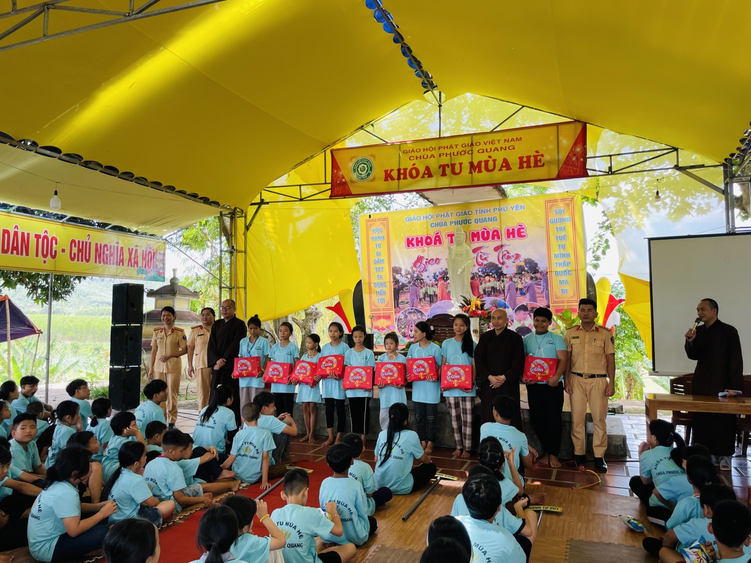 Tại đây, Phòng CSGT đã thông tin về tình hình trật tự an toàn giao thông trên địa bàn, những nguyên nhân phổ biến dẫn đến tai nạn giao thông; hậu quả, di chứng, hệ lụy do tai nạn giao thông gây ra đối với người bị nạn, gia đình và xã hội; một số hành vi vi phạm giao thông phổ biến ở lứa tuổi học sinh, thanh thiếu niên. Đồng thời, giới thiệu các quy tắc khi tham gia giao thông, hướng dẫn kỹ năng tham gia giao thông an toàn, cách nhận biết, hiểu rõ về biển báo và tín hiệu đèn giao thông, nguyên nhân dẫn đến tai nạn và cách xử lý các tình huống tai nạn giao thông xảy ra… Buổi tuyên truyền giúp các em hiểu rõ hơn về Luật giao thông đường bộ, góp phần nâng cao ý thức chấp hành quy định của pháp luật và bảo đảm an toàn cho các em khi tham gia giao thông, phòng ngừa vi phạm và tai nạn giao thông.Dịp này, Hội phụ nữ và Chi đoàn Phòng CSGT đã tặng 20 suất quà cho các em có hoàn cảnh khó khăn đang tham gia khóa tu mùa hè tại đây.