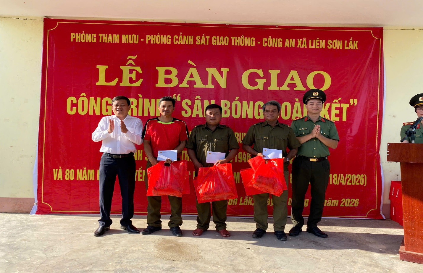 Chiều ngày 06/02/2026, tại buôn Drung, xã Liên Sơn Lắk, Phòng Tham mưu phối hợp cùng Phòng Cảnh sát giao thông và Công an xã Liên Sơn Lắk đã long trọng tổ chức Lễ khánh thành và bàn giao Công trình "Sân bóng đoàn kết". Đây là hoạt động thiết thực nằm trong khuôn khổ mô hình “Dân vận khéo” năm 2026.