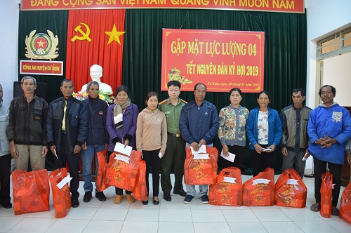 Nhân dịp chuẩn bị đón Tết cổ truyền của dân tộc, sáng ngày 28/01/2019, Đảng ủy, lãnh đạo Công an huyện Cư Kuin đã tổ chức buổi gặp mặt, thăm hỏi, tặng quà cho 29 quần chúng tiêu biểu trong công tác đảm bảo ANTT