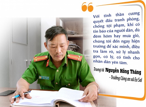 Vượt qua những khó khăn ban đầu về cơ sở vật chất, trang thiết bị, công cụ hỗ trợ, Công an xã Ea Sol nhanh chóng xây dựng kế hoạch, triển khai đồng bộ các biện pháp nghiệp vụ đảm bảo ANTT; phát động phong trào “Toàn dân bảo vệ an ninh Tổ quốc” sâu rộng đến mọi tầng lớp nhân dân; tuyên truyền, vận động nhân dân tự phòng, tự quản, bảo vệ tài sản, cảnh giác với các loại tội phạm…