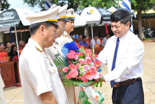 Đồng chí Phạm Minh Tấn, Phó Bí thư tỉnh uỷ Đắk Lắk tặng hoa chúc mừng, động viên các cán bộ, chiến sĩ được điều động đảm nhiệm các chức danh Công an xã.