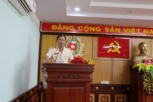 Đồng chí Trung tá Nguyễn Thanh Hải - Phó Bí thư Đảng ủy, Phó Trưởng Phòng Tham mưu phát biểu