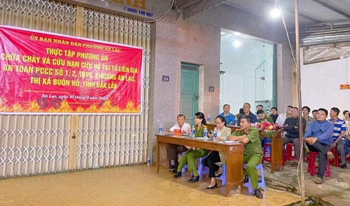 Thực hiện chỉ đạo Bộ Công an về việc hướng dẫn thực tập phương án CC và CNCH, Tổ liên gia an toàn PCCC theo ý kiến chỉ đạo của Lãnh đạo Bộ Công an. Ngày 10/9/2023, UBND phường An Lạc tổ chức thực tập phương án chữa cháy Tổ liên gia an toàn PCCC số 1, 2 tại tổ dân phố 6, phường An Lạc, thị xã Buôn Hồ, Đắk Lắk.