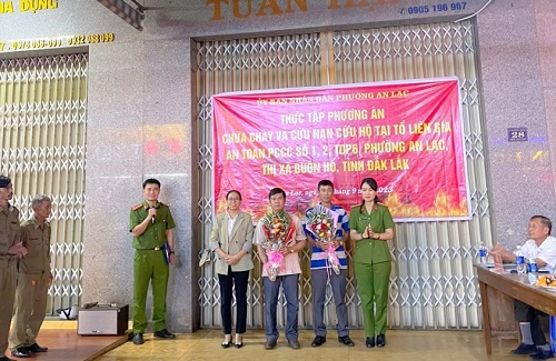 Tham gia buổi diễn tập có đồng chí Thượng tá Lê Thị Kim Anh – Phó trưởng Công an thị xã Buôn Hồ, Lãnh đạo UBND phường An Lạc, chỉ huy, CBCS Công an các phường, xã, Đội Cảnh sát PCCC và CNCH và toàn thể nhân dân tham gia Tổ liên gia an toàn PCCC số 1, 2 tổ dân phố 6, phường An Lạc.