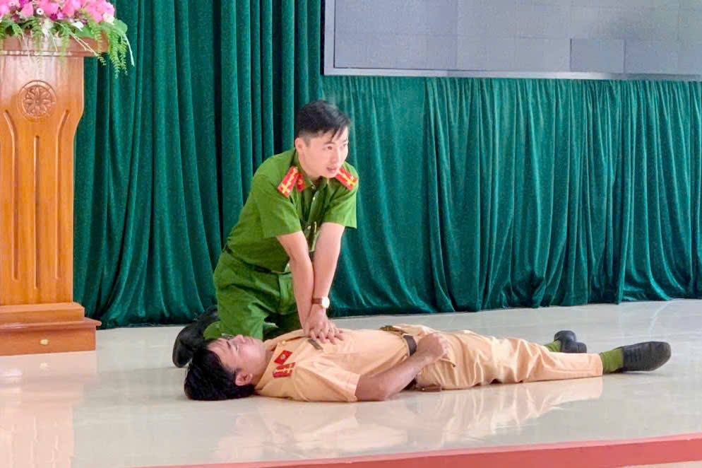 Đồng chí Đại úy Nguyễn Xuân Vinh, Cán bộ (đơn vị: Phòng Cảnh sát PCCC và CNCH) hướng dẫn các phương pháp sơ cấp cứu ban đầu