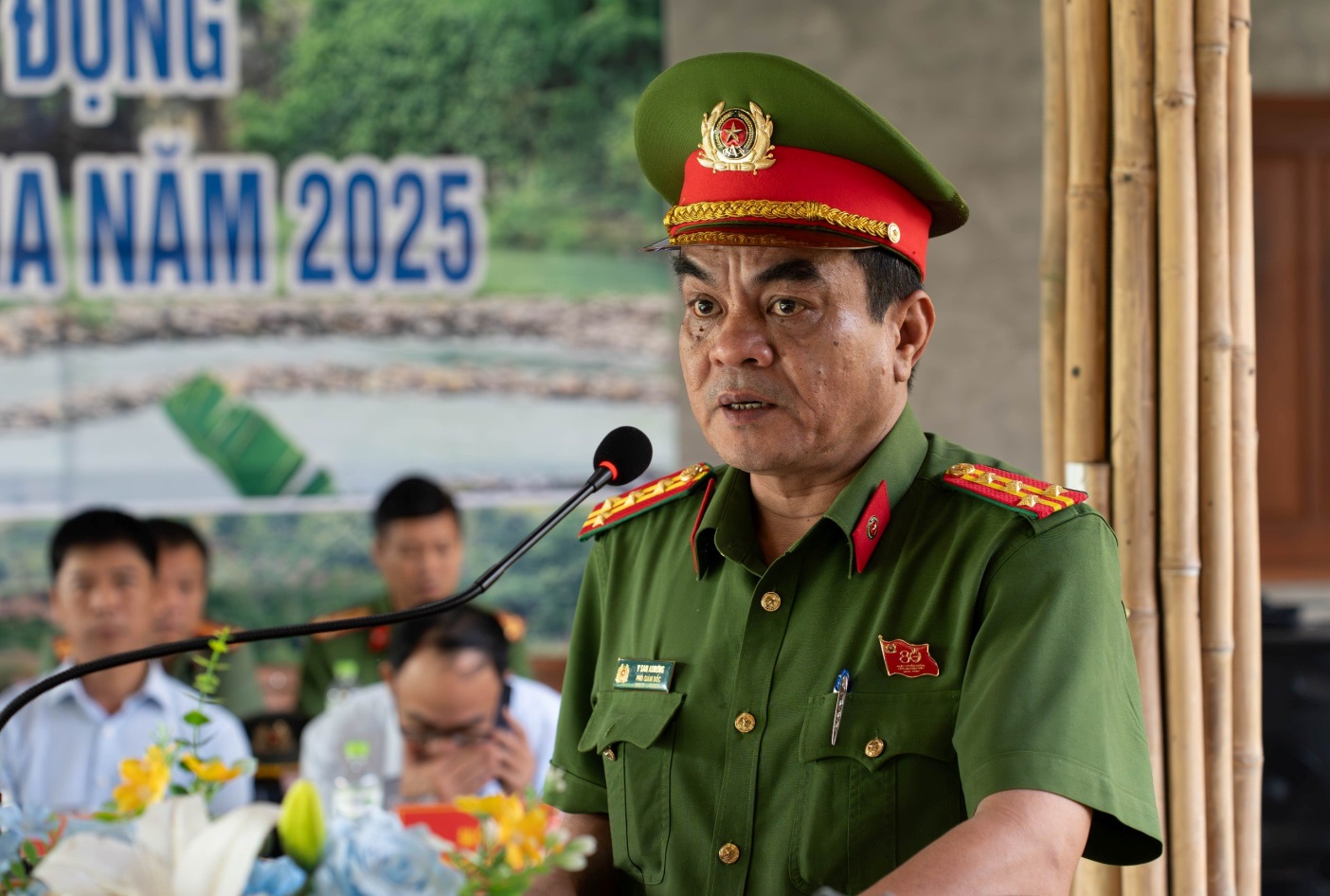 Đồng chí Đại tá Y San ADrơng, Phó Giám đốc Công an tỉnh tặng hoa và chụp hình lưu niệm với lực lượng tham gia thực tập.
