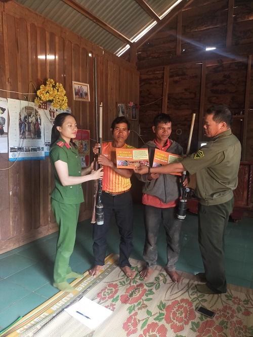 Quán triệt phương châm “Vào từng ngõ, gõ từng nhà, rà từng đối tượng”, ngày 03/07/2020, Công an huyện đã tổ chức Chương trình ra quân “Chiến dịch thu hồi vũ khí, vật liệu nổ, công cụ hỗ trợ và pháo nổ” để tiến hành tuyên truyền, vận động nhân dân các thôn, buôn, tổ dân phố tại các xã, thị trấn trên địa bàn huyện giao nộp vũ khí, vật liệu nổ, công cụ hỗ trợ và pháo nổ. Cán bộ chiến sỹ của Công an huyện đã cùng với lực lượng Công an các xã, thị trấn phối hợp với các già làng, người có uy tín để nắm bắt tình hình, nắm chắc từng trường hợp còn tàng trữ vũ khí trái phép, sau đó đến tận nhà để tuyên truyền, vận động người dân giao nộp.