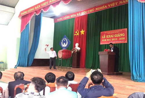 Hiệu trưởng trường THCS Phan Bội Châu phát biểu, đánh trống khai trường năm học 2019 – 2020