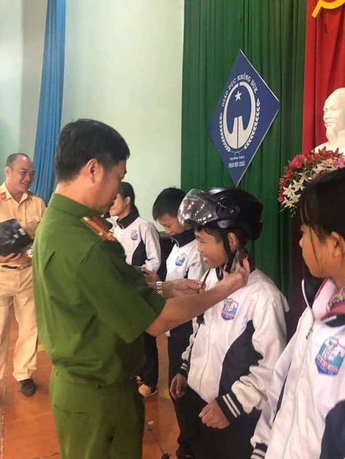 Đồng chí Trần Quang Tài trao quà là những chiếc mũ bảo hiểm đạt tiêu chuẩn cho các em trả lời đúng