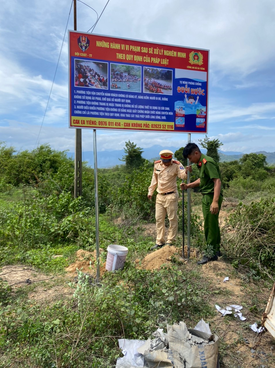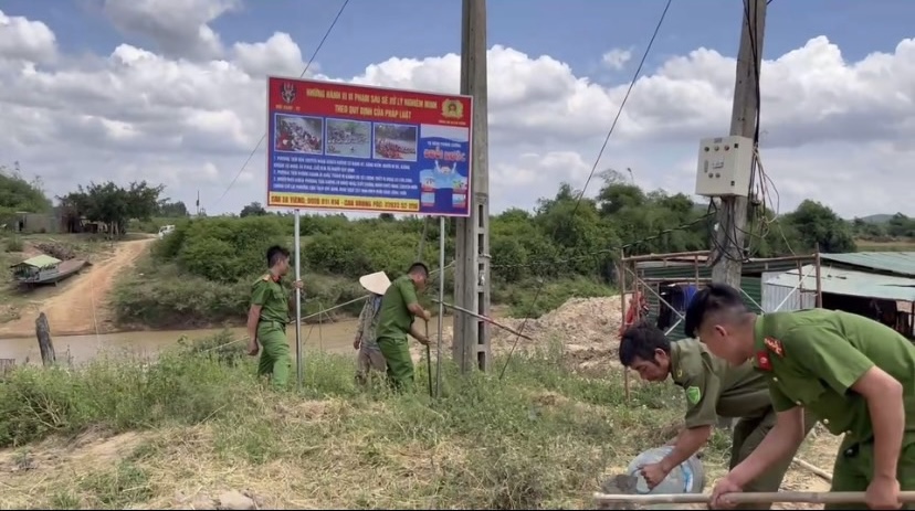 Lực lượng Công an huyện Krông Pắc tổ chức cắm bảng tuyên truyền pháp luật và cảnh báo nguy hiểm