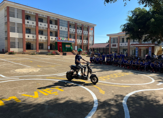 Các học sinh được thực hành kỹ năng điều khiển xe máy điện