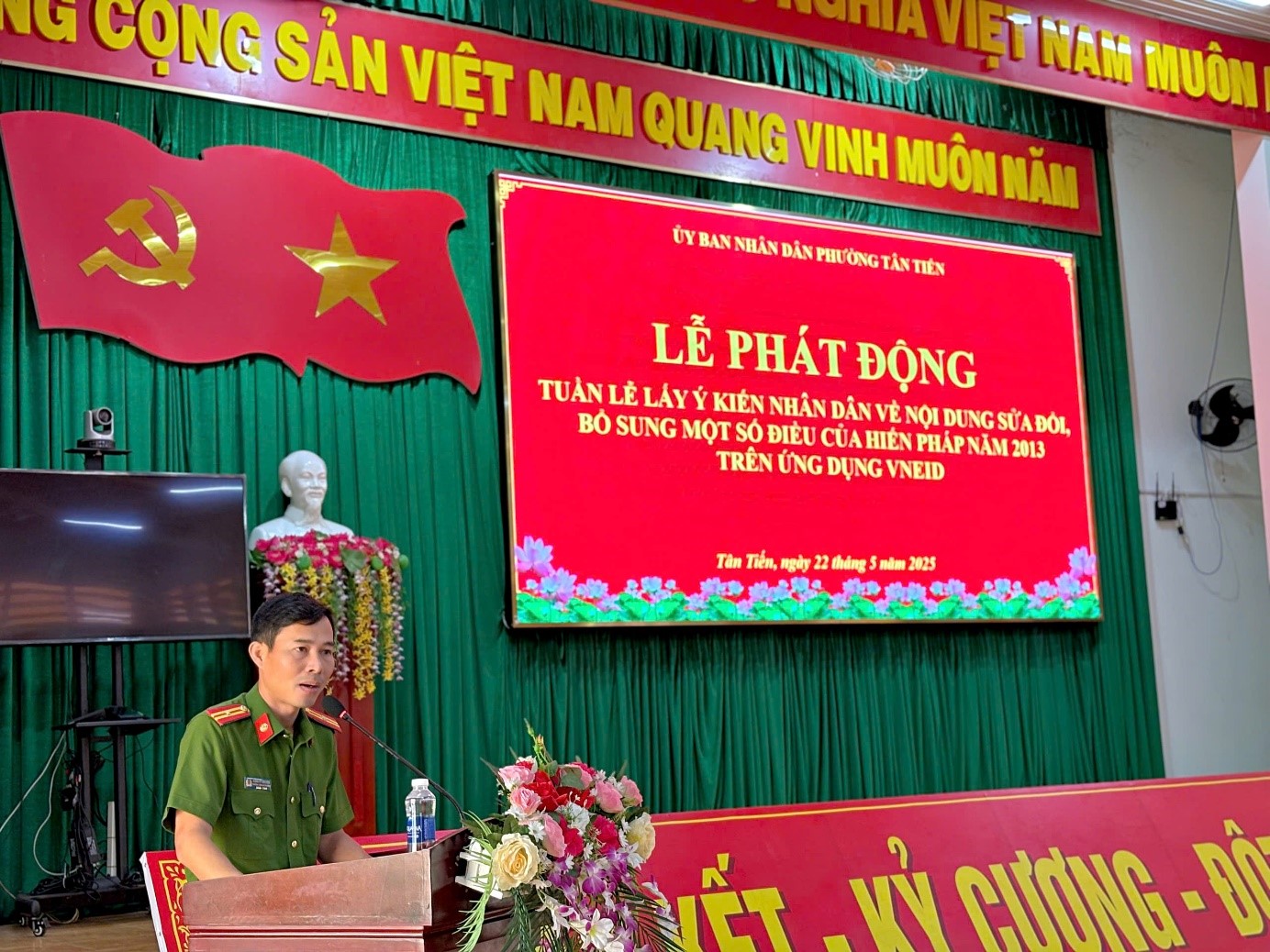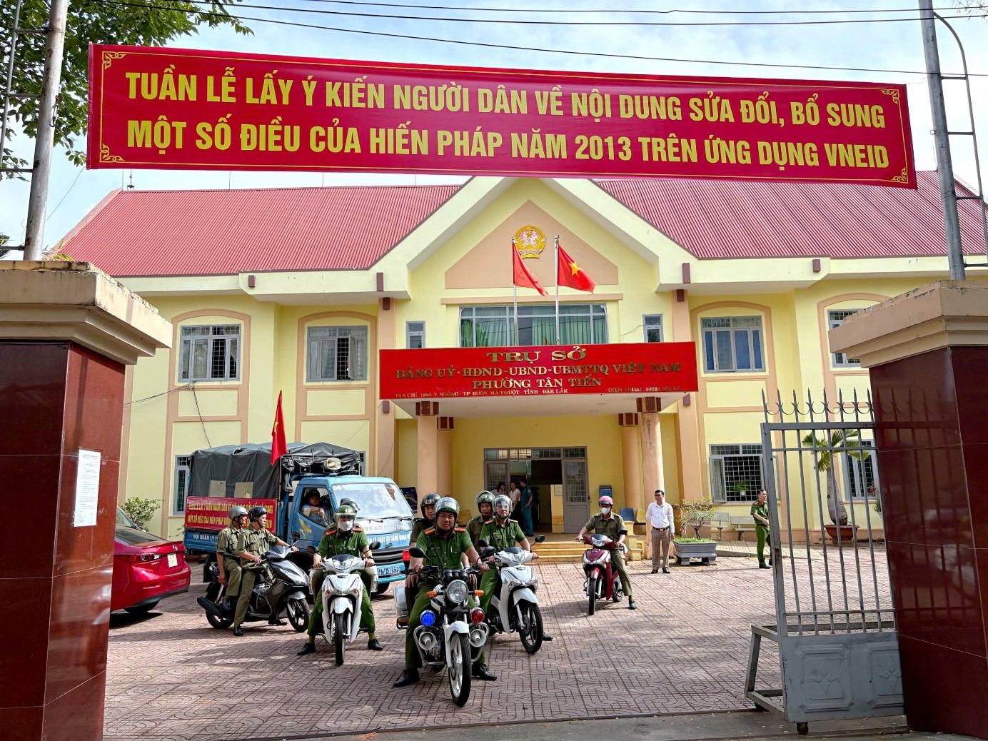 Sáng ngày 22/5/2025, Công an phường Tân Tiến, thành phố Buôn Ma Thuột đã phối hợp với UBND cùng cấp tổ chức buổi lễ phát động “Tuần lễ lấy ý kiến nhân dân về nội dung sửa đổi, bổ sung một số điều của Hiến pháp năm 2013 trên ứng dụng VNeID” trên địa bàn phường Tân Tiến (từ ngày 22/5/2025 – 28/5/2025). Sự kiện này nhằm khuyến khích người dân tham gia đóng góp ý kiến, thể hiện quyền làm chủ của mình trong việc xây dựng và hoàn thiện hệ thống pháp luật của đất nước.